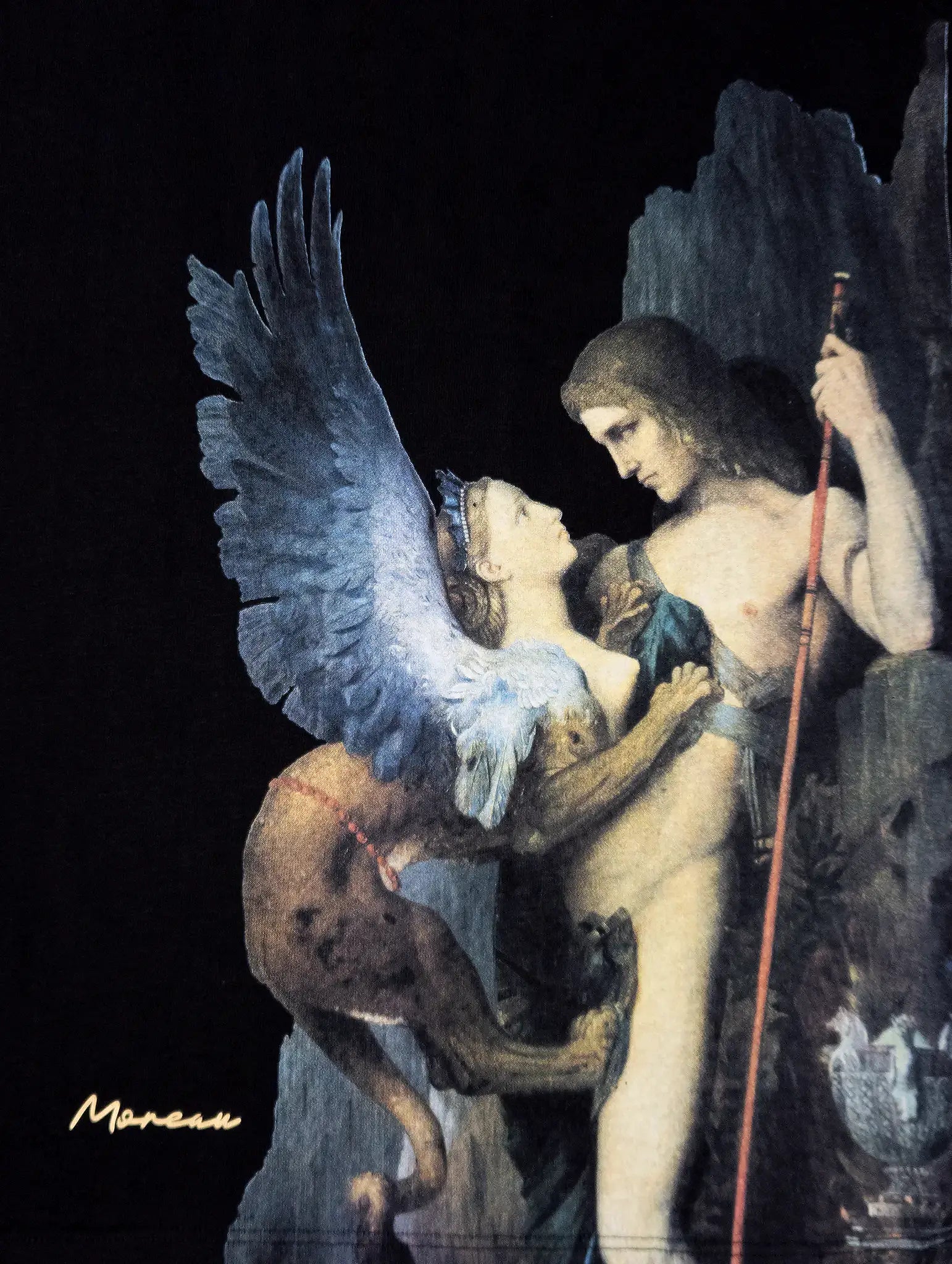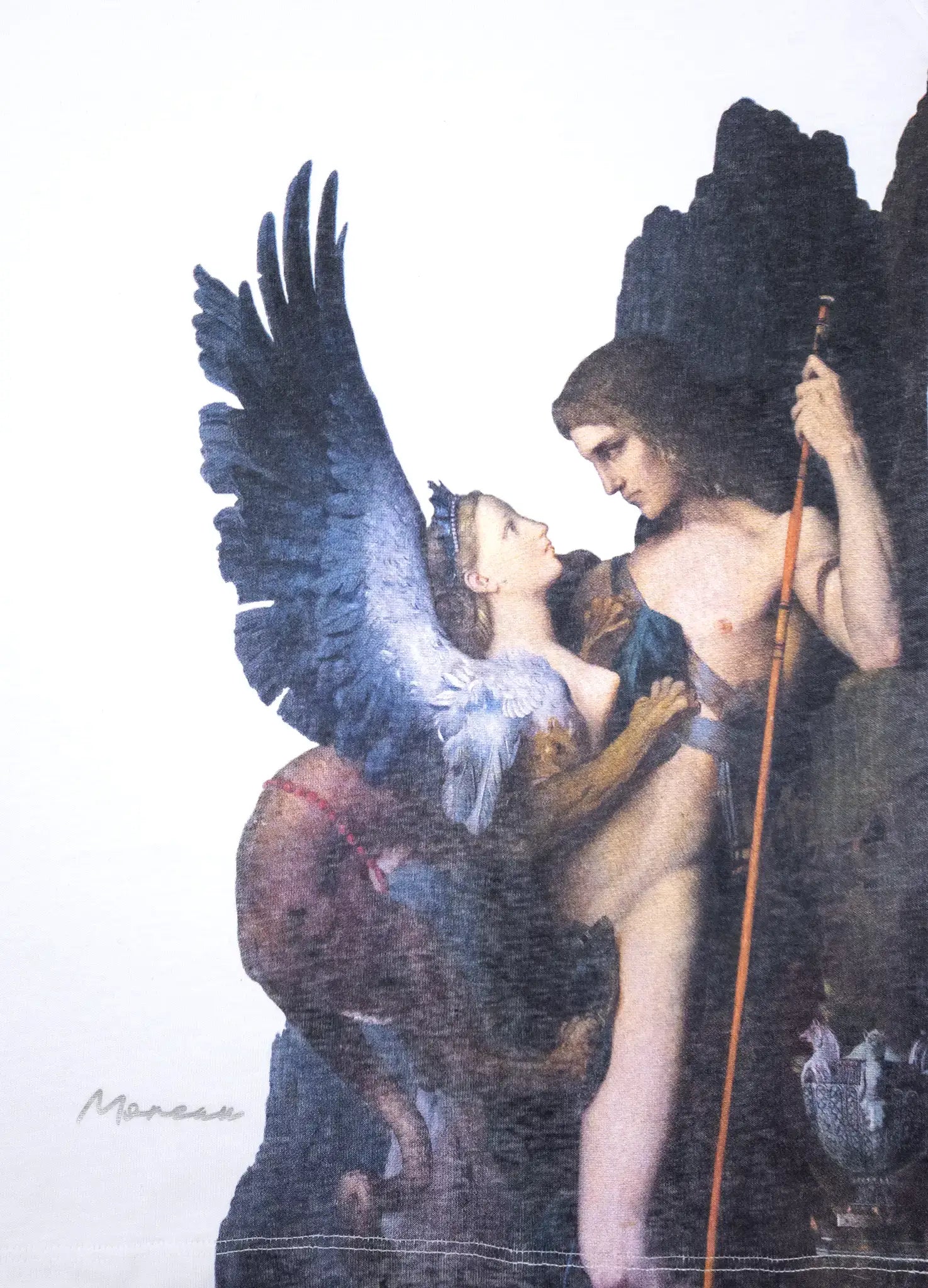 Una pieza que fusiona arte clásico y moda contemporánea. Inspirada en la obra de Gustave Moreau, esta playera captura el momento mítico entre Edipo y la Esfinge, símbolo del enigma y la búsqueda de respuestas.
