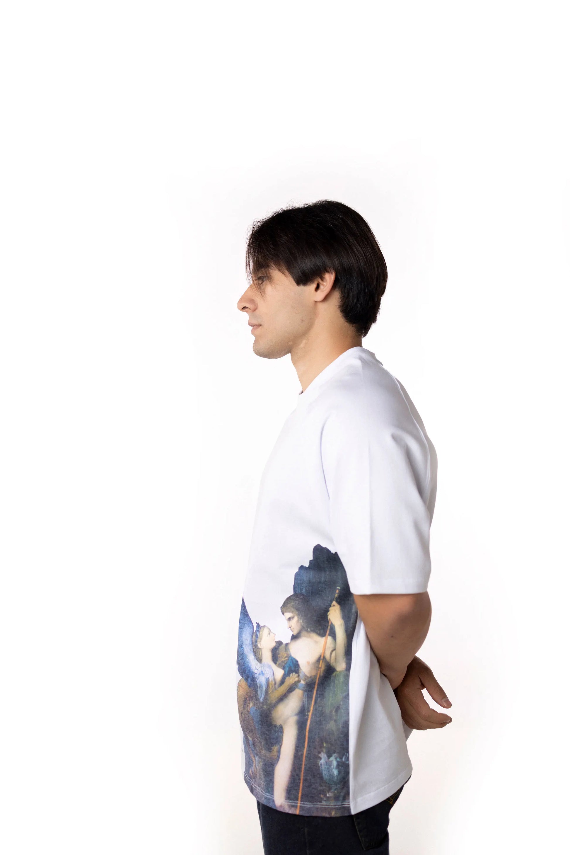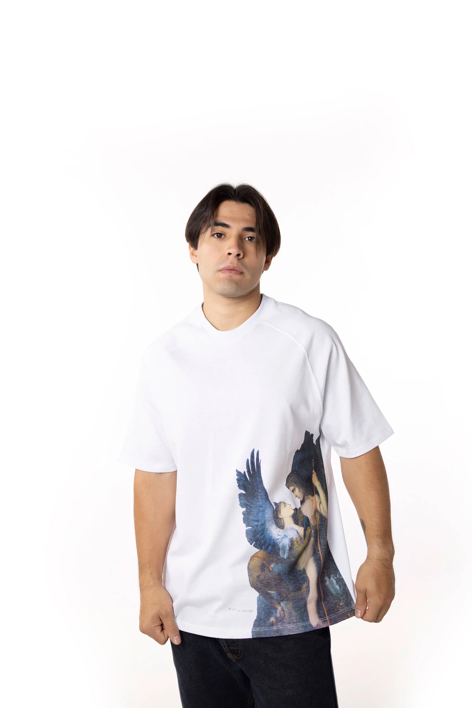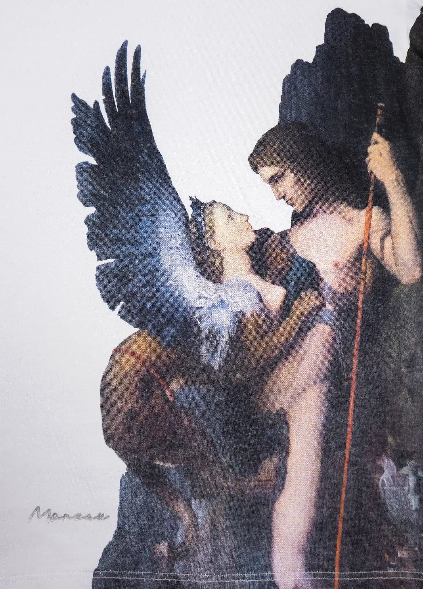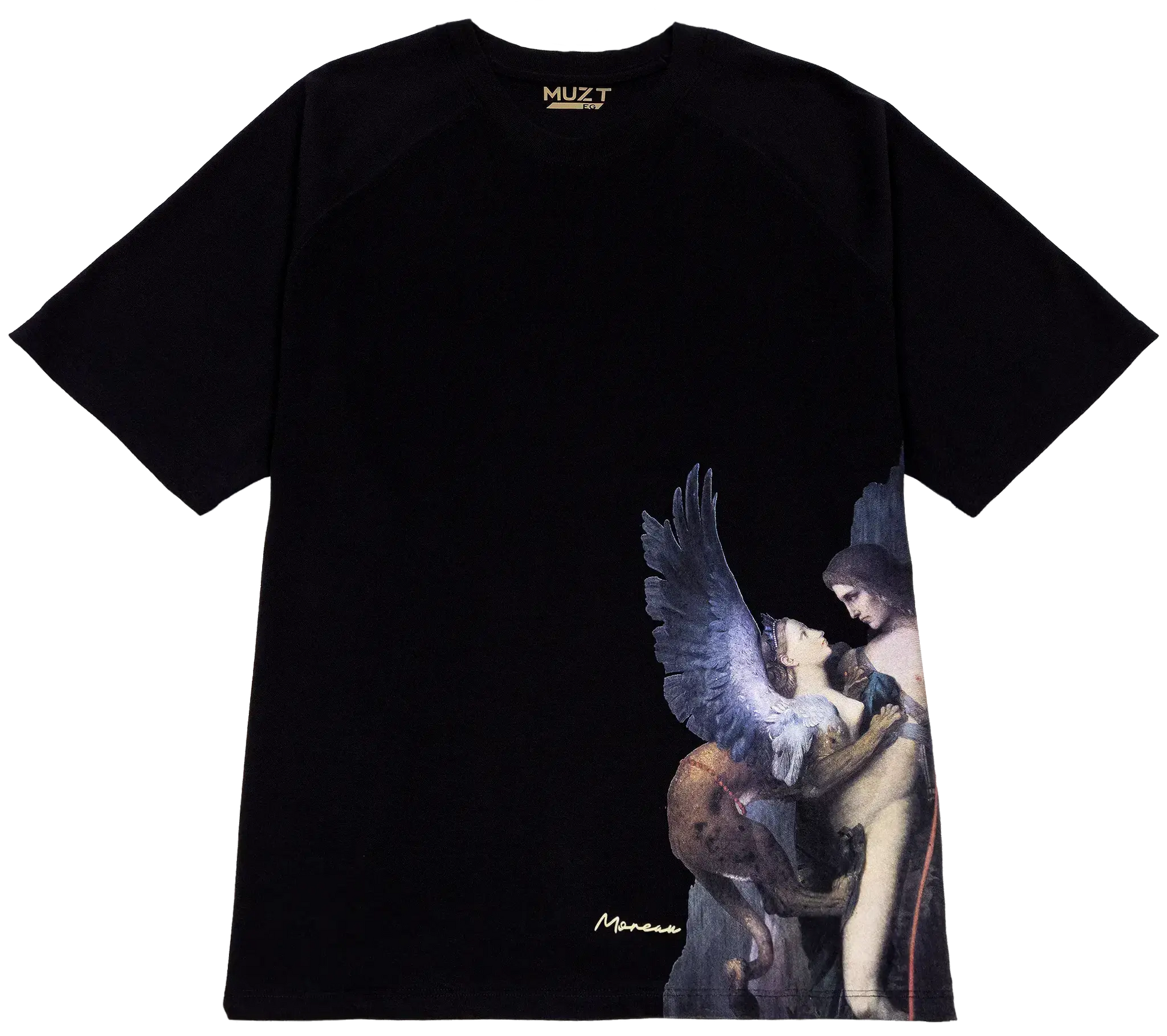 Una pieza que fusiona arte clásico y moda contemporánea. Inspirada en la obra de Gustave Moreau, esta playera captura el momento mítico entre Edipo y la Esfinge, símbolo del enigma y la búsqueda de respuestas.