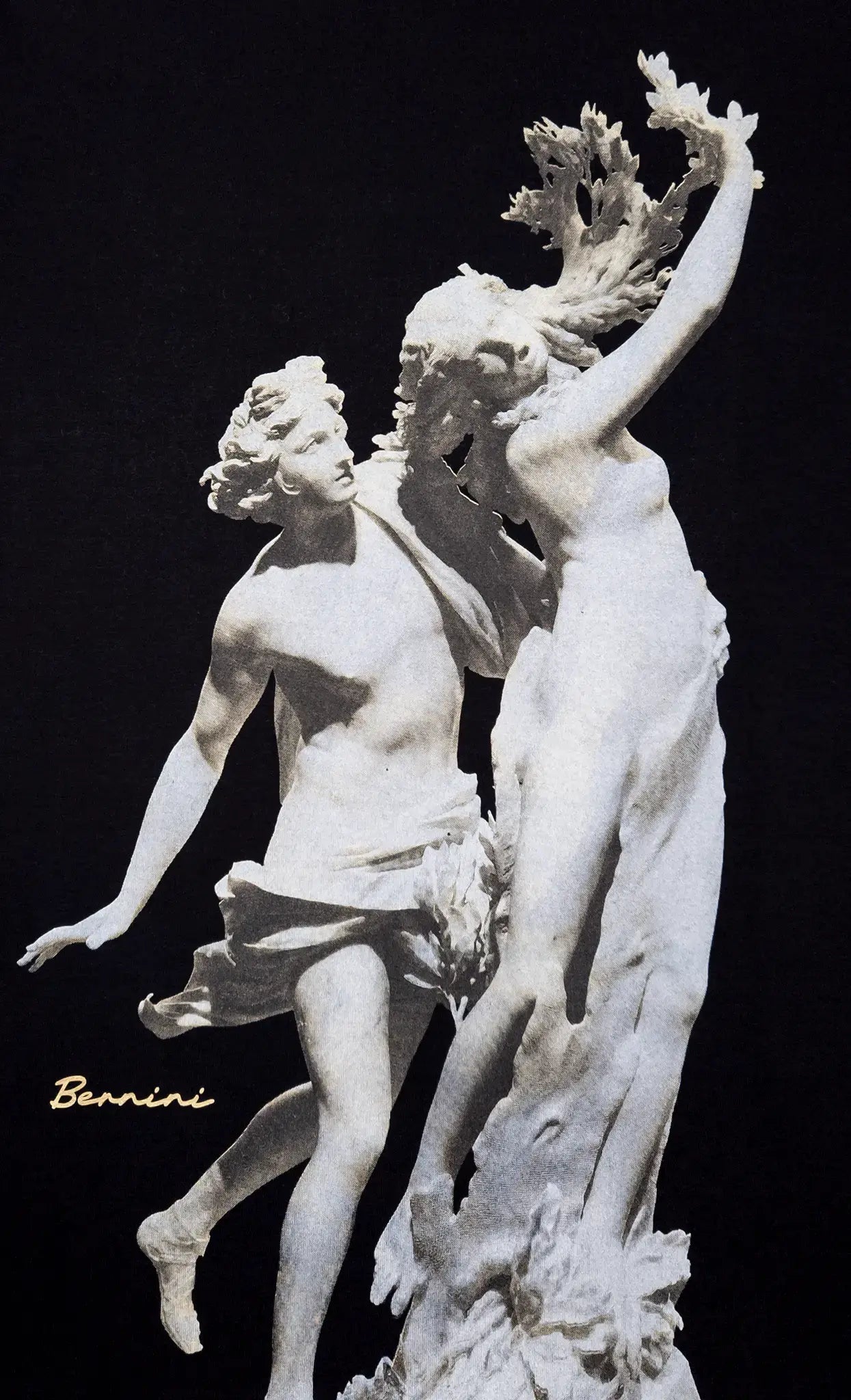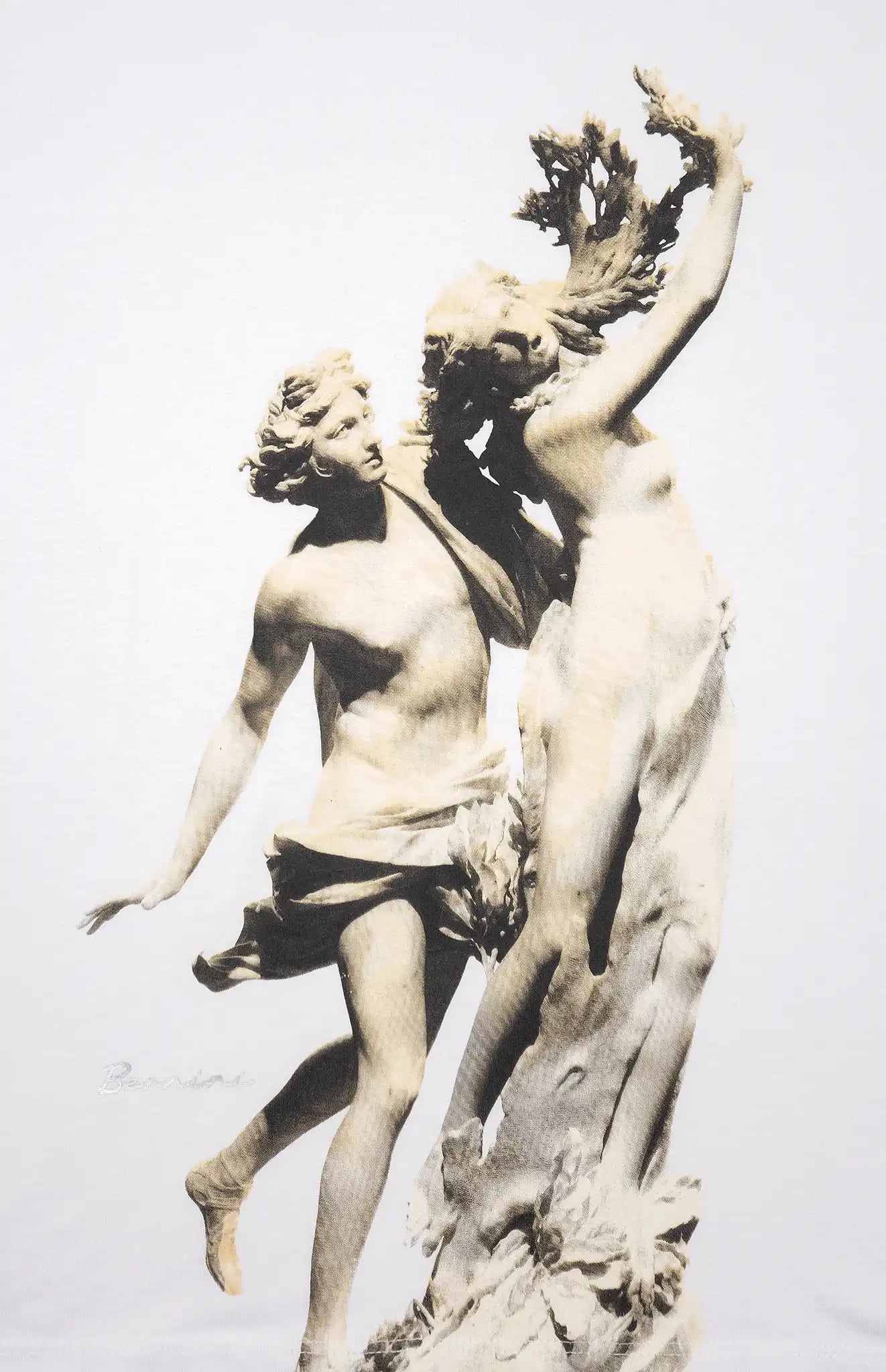 El instante en que todo cambia queda inmortalizado en esta pieza. Inspirada en la escultura maestra de Gian Lorenzo Bernini, la playera captura el momento dramático en que Dafne se transforma en laurel para escapar del deseo de Apolo.