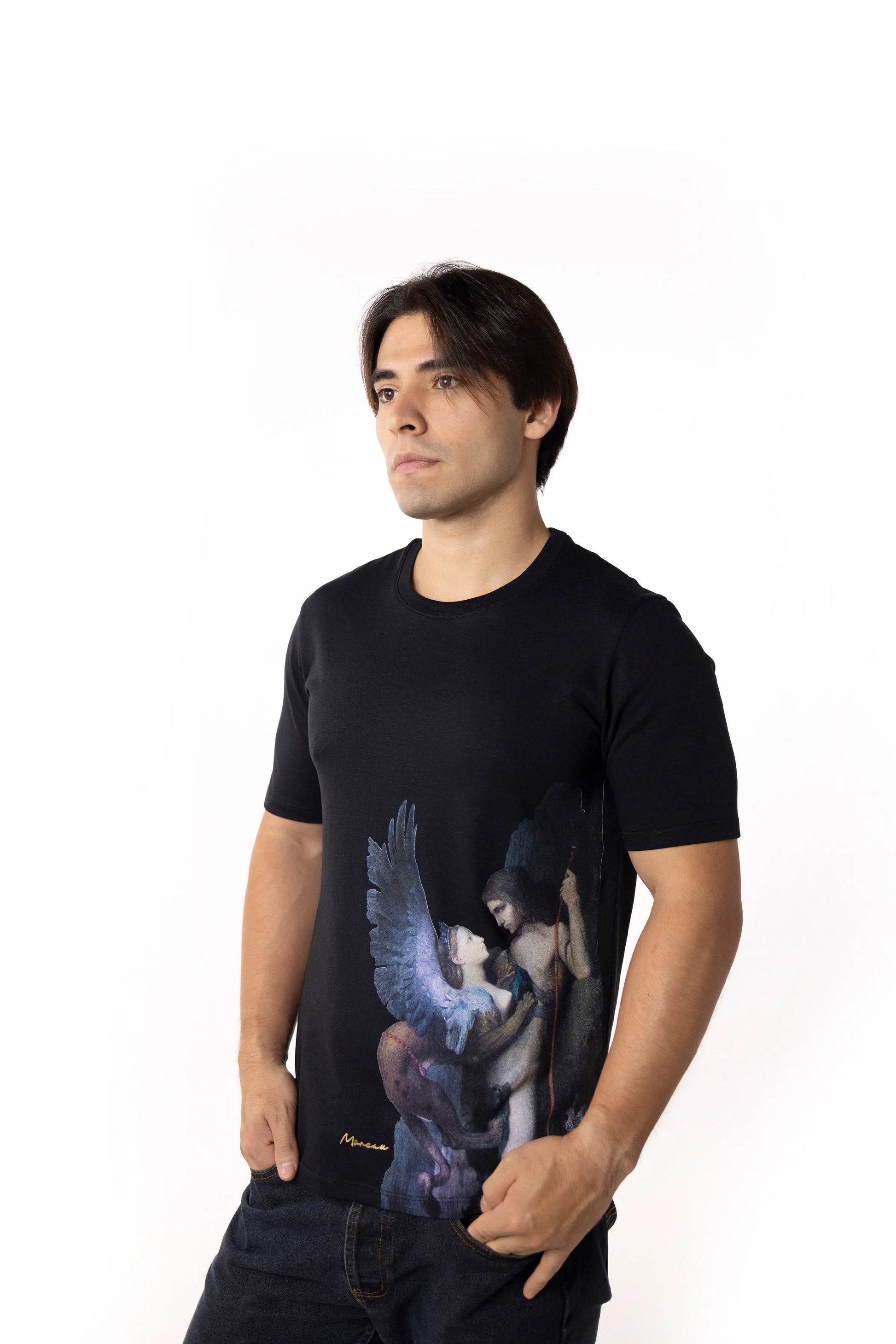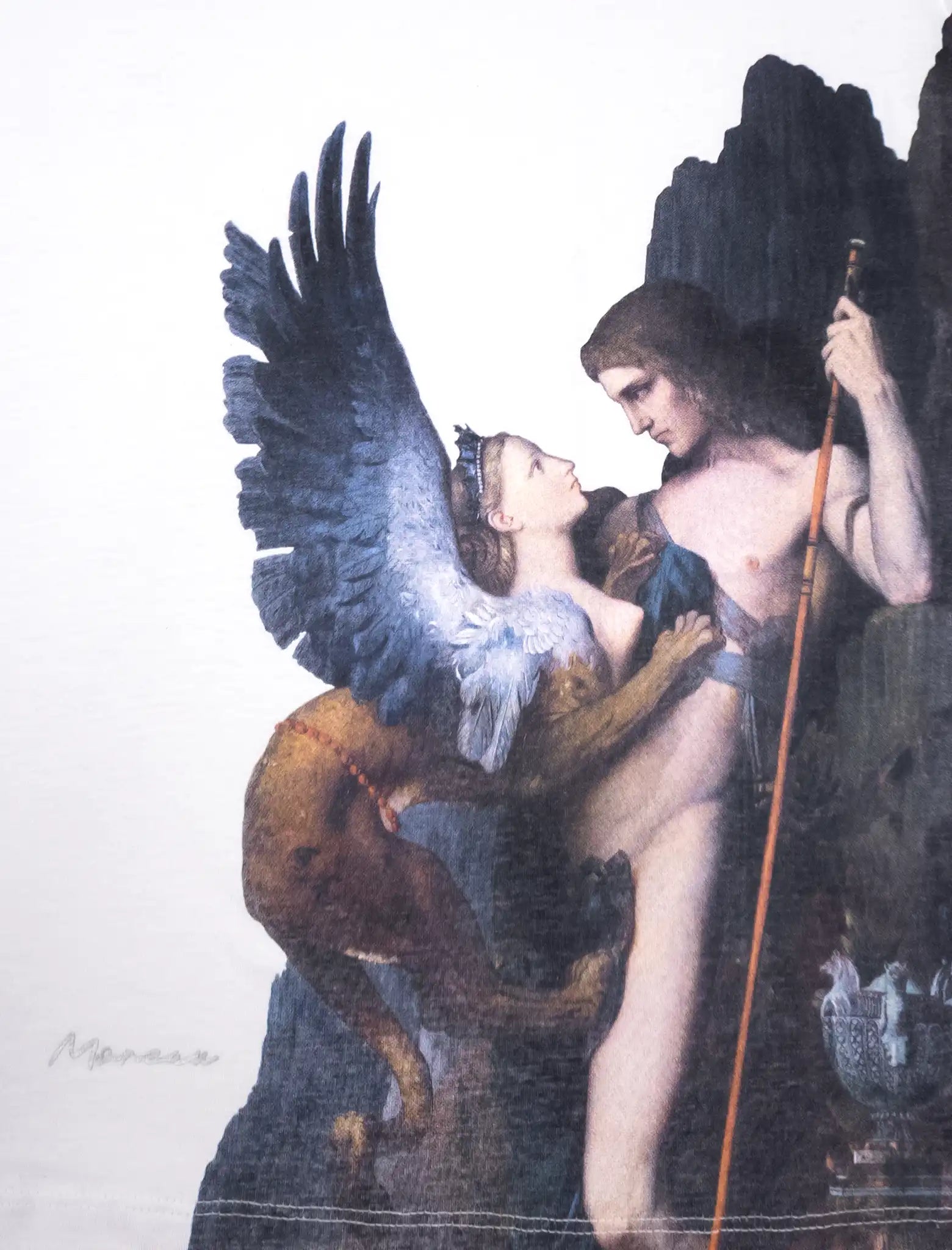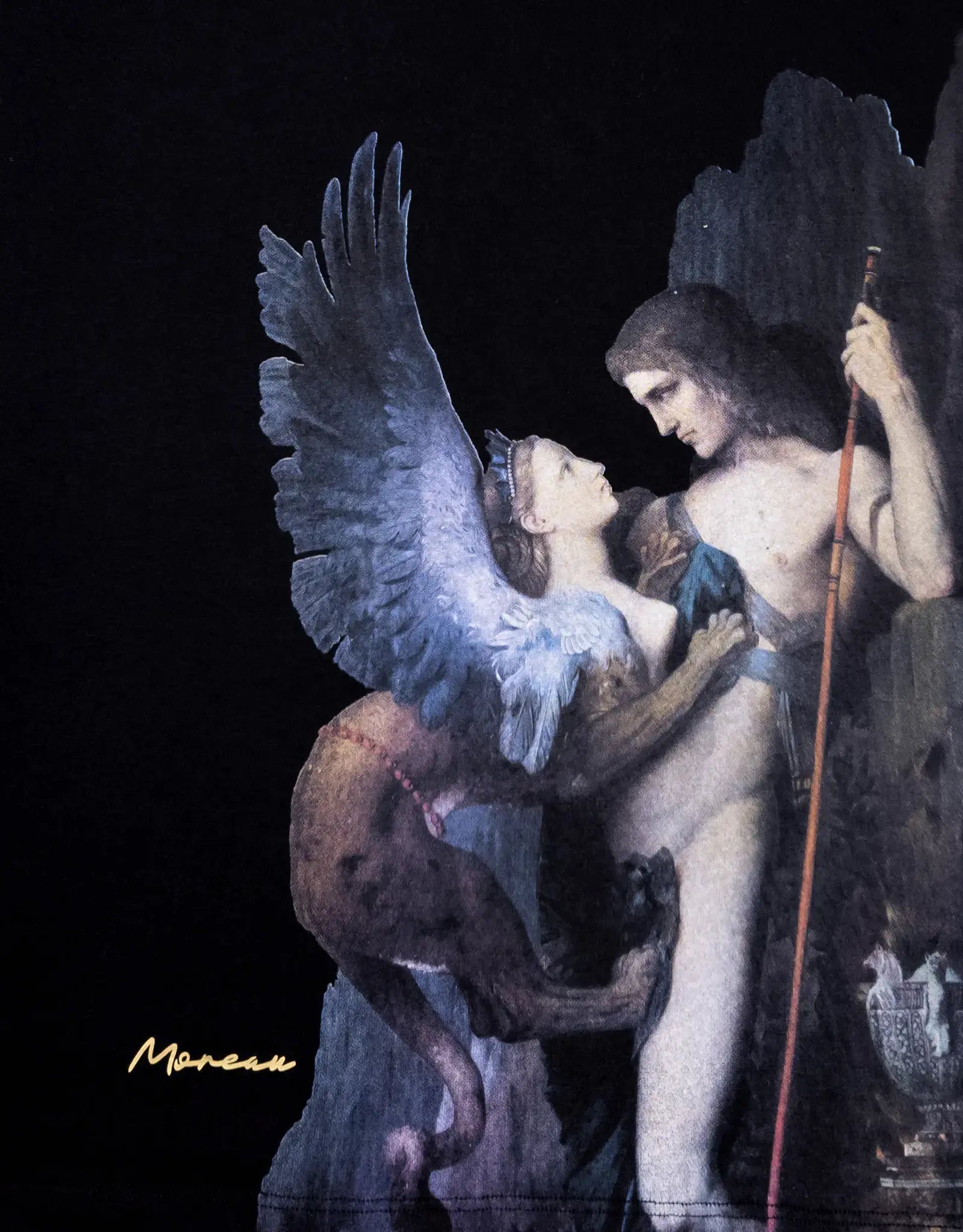 Una pieza que fusiona arte clásico y moda contemporánea. Inspirada en la obra de Gustave Moreau, esta playera captura el momento mítico entre Edipo y la Esfinge, símbolo del enigma y la búsqueda de respuestas.