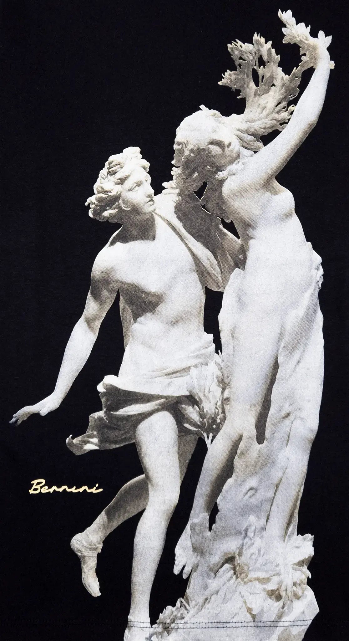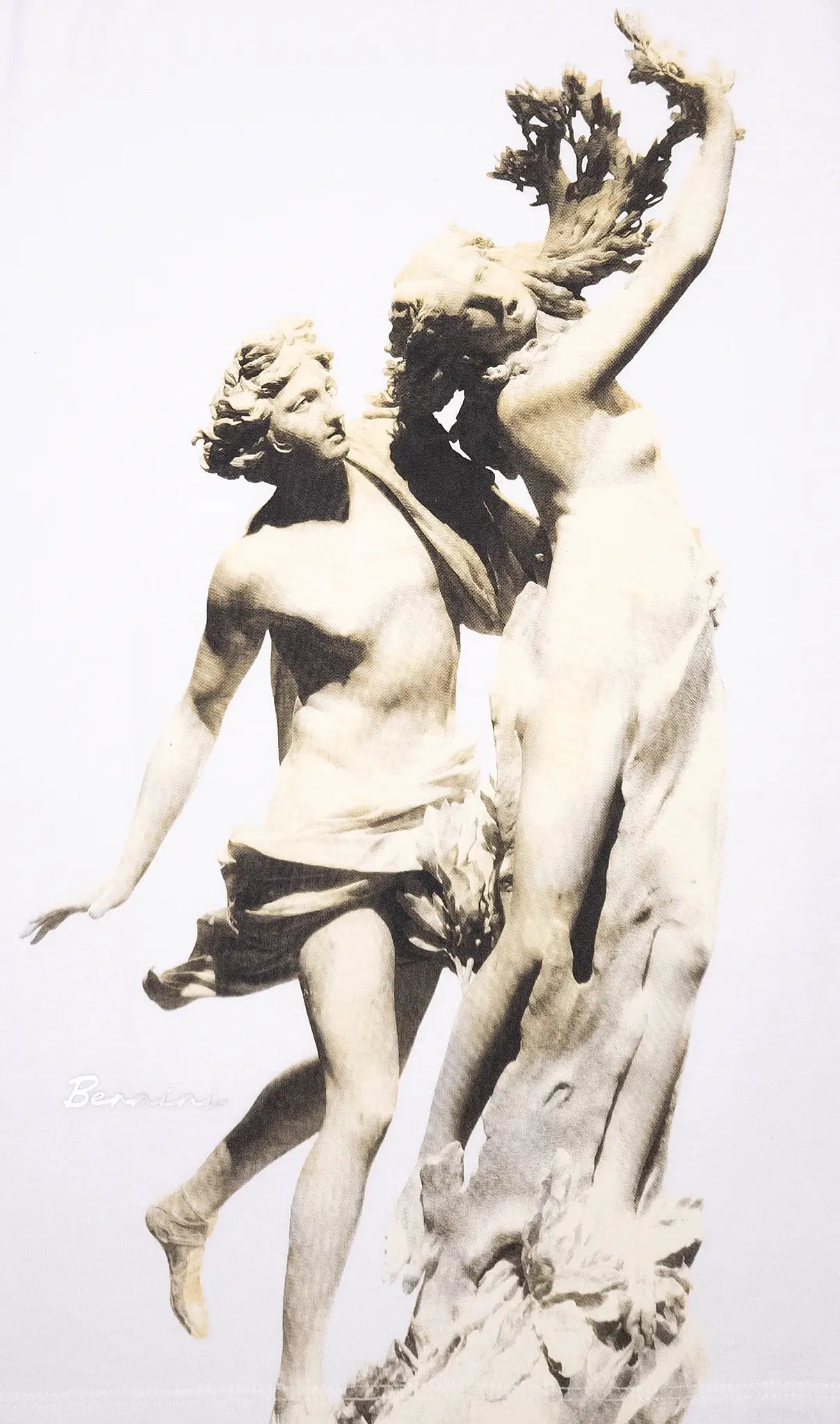 El instante en que todo cambia queda inmortalizado en esta pieza. Inspirada en la escultura maestra de Gian Lorenzo Bernini, la playera captura el momento dramático en que Dafne se transforma en laurel para escapar del deseo de Apolo.