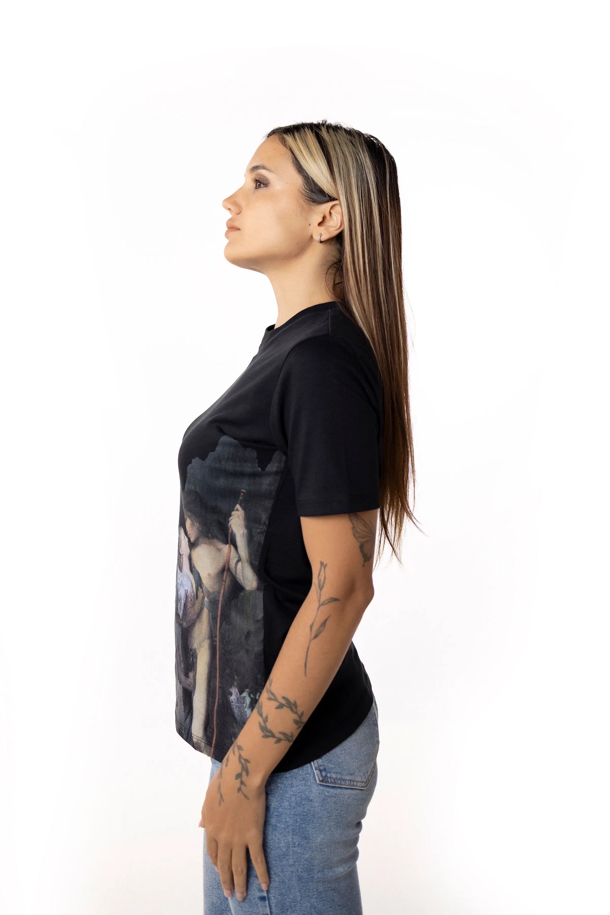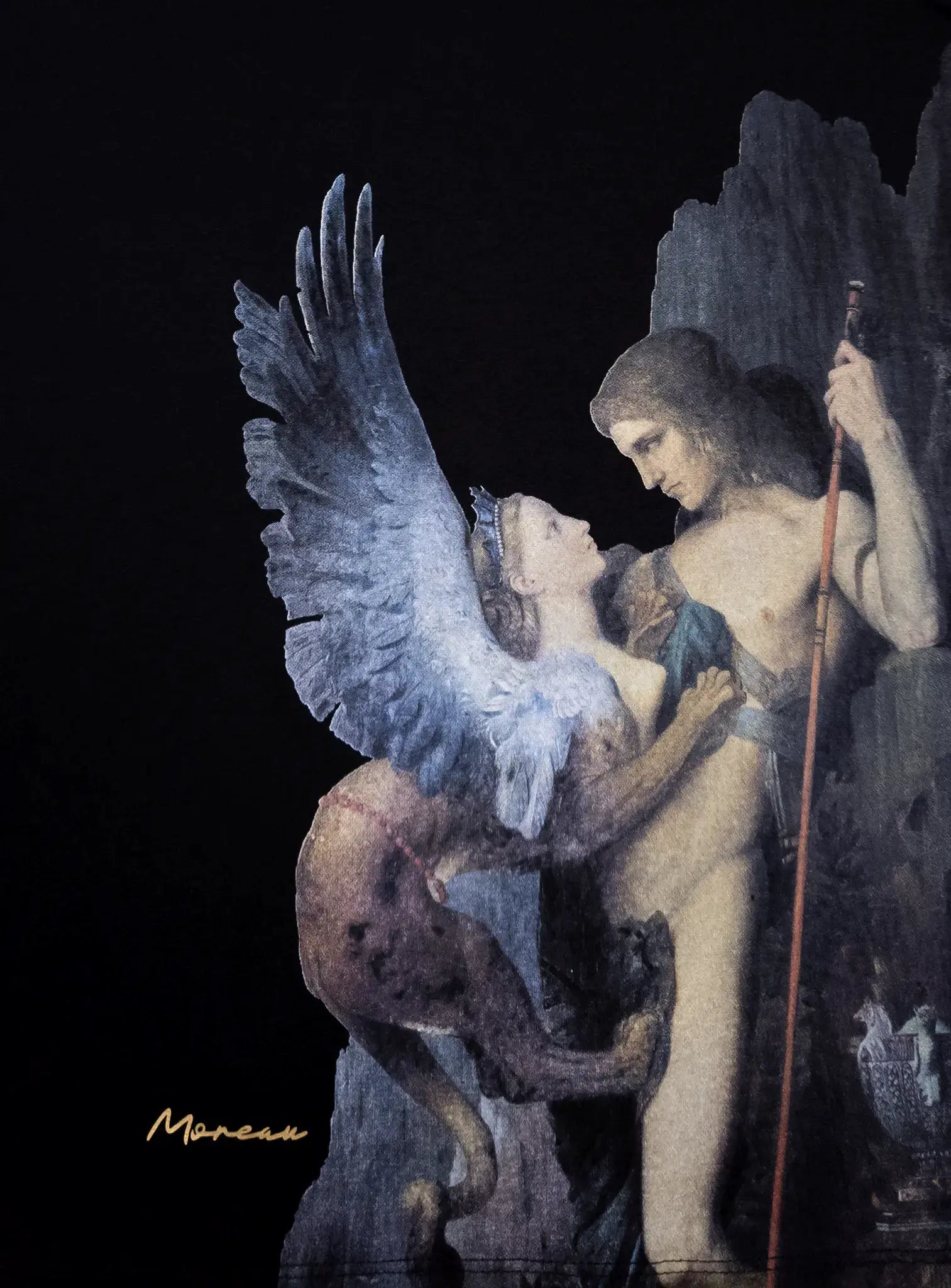Una pieza que fusiona arte clásico y moda contemporánea. Inspirada en la obra de Gustave Moreau, esta playera captura el momento mítico entre Edipo y la Esfinge, símbolo del enigma y la búsqueda de respuestas.