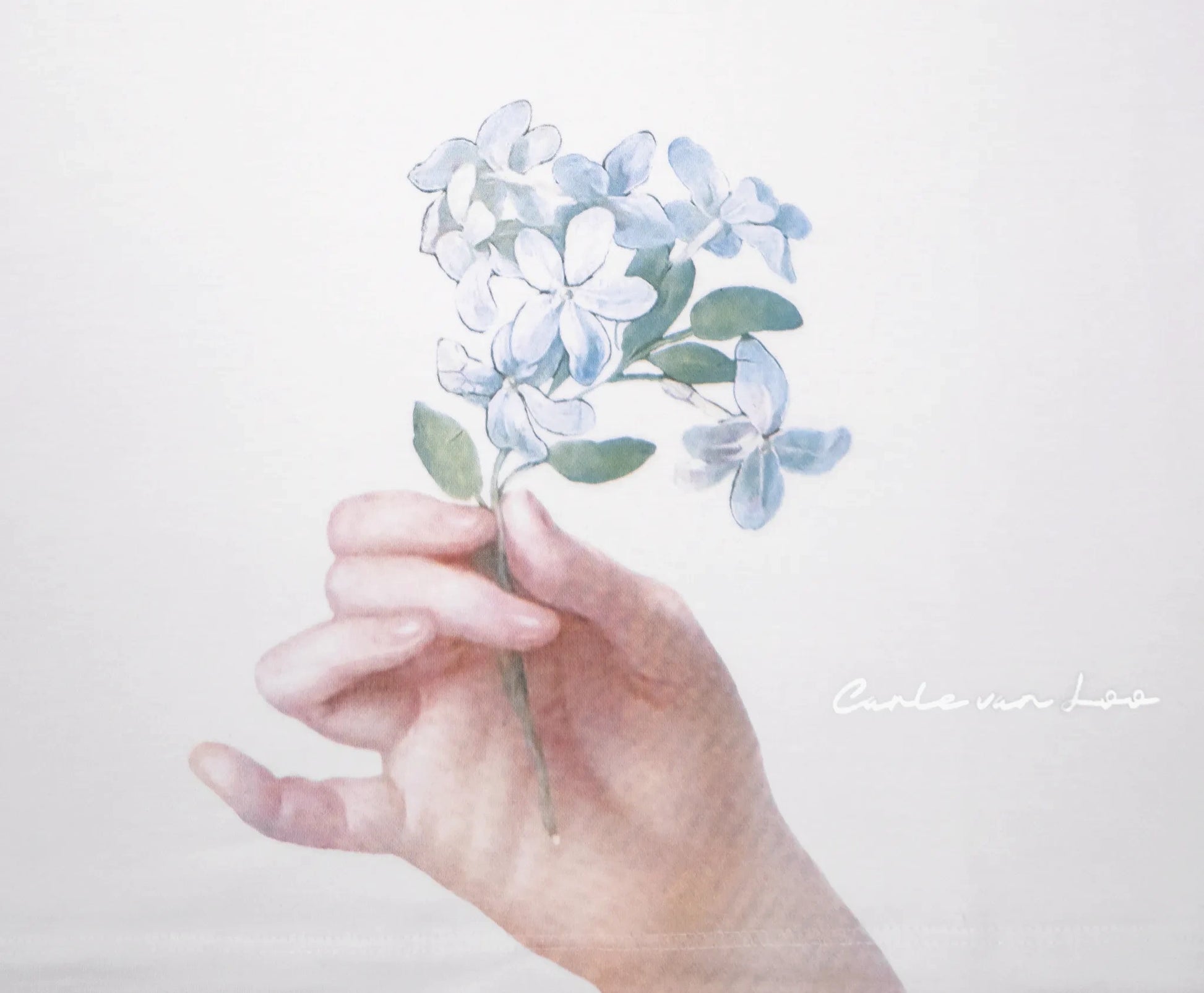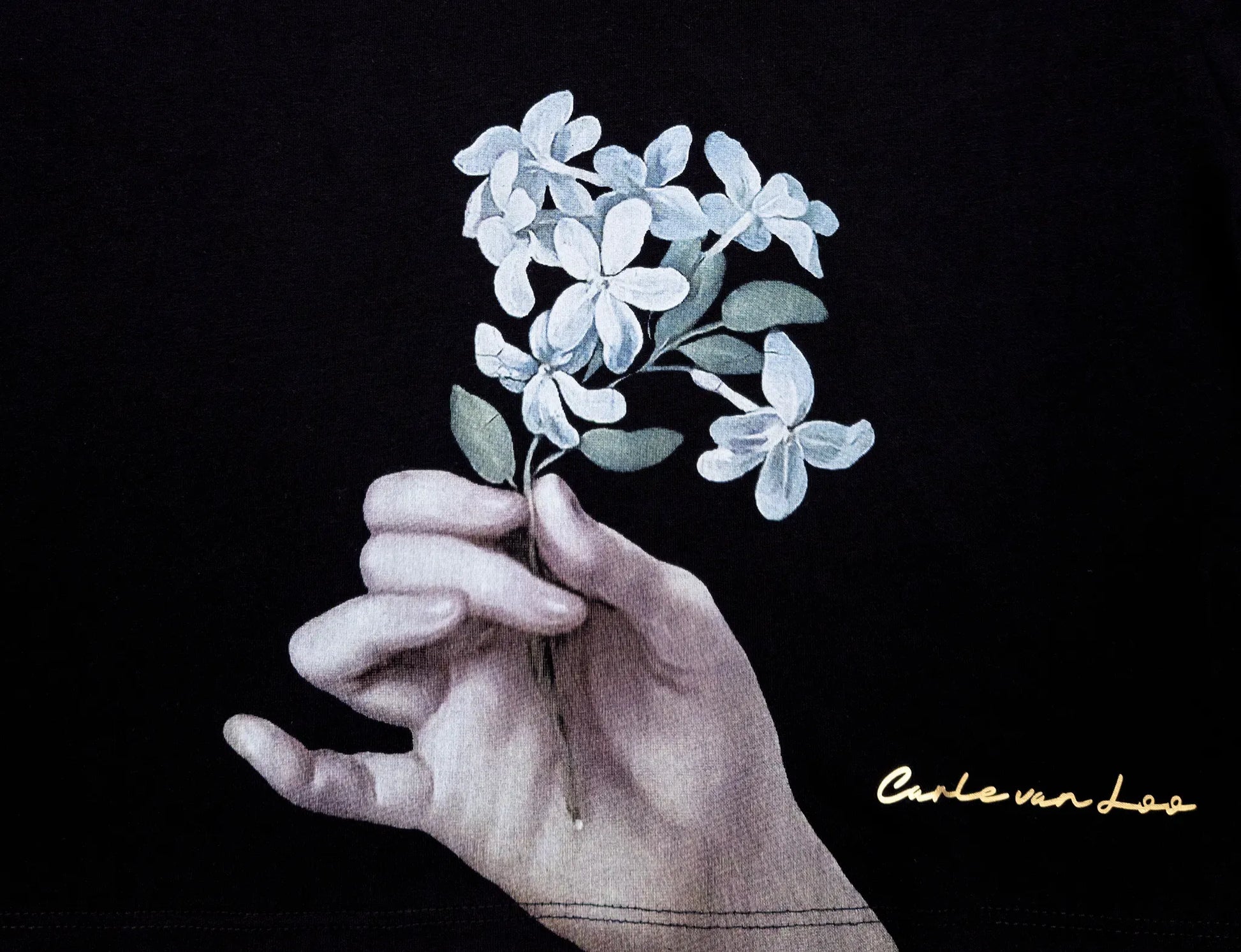 Un detalle que dice más que mil palabras. Fragmento inspirado en la obra de Carle van Loo, esta playera captura la elegancia de una mano que sostiene flores, símbolo de delicadeza, gracia y sensibilidad atemporal.