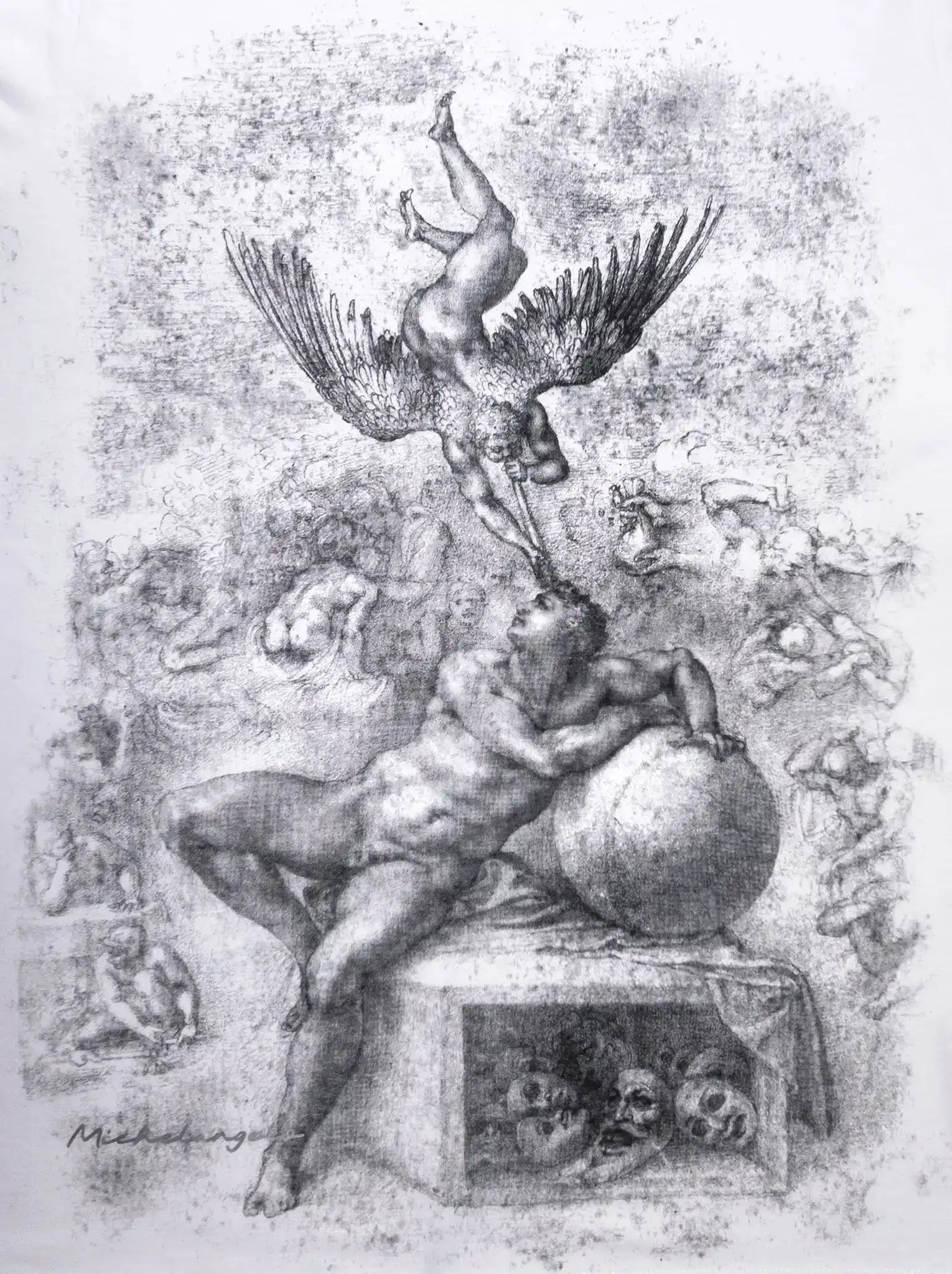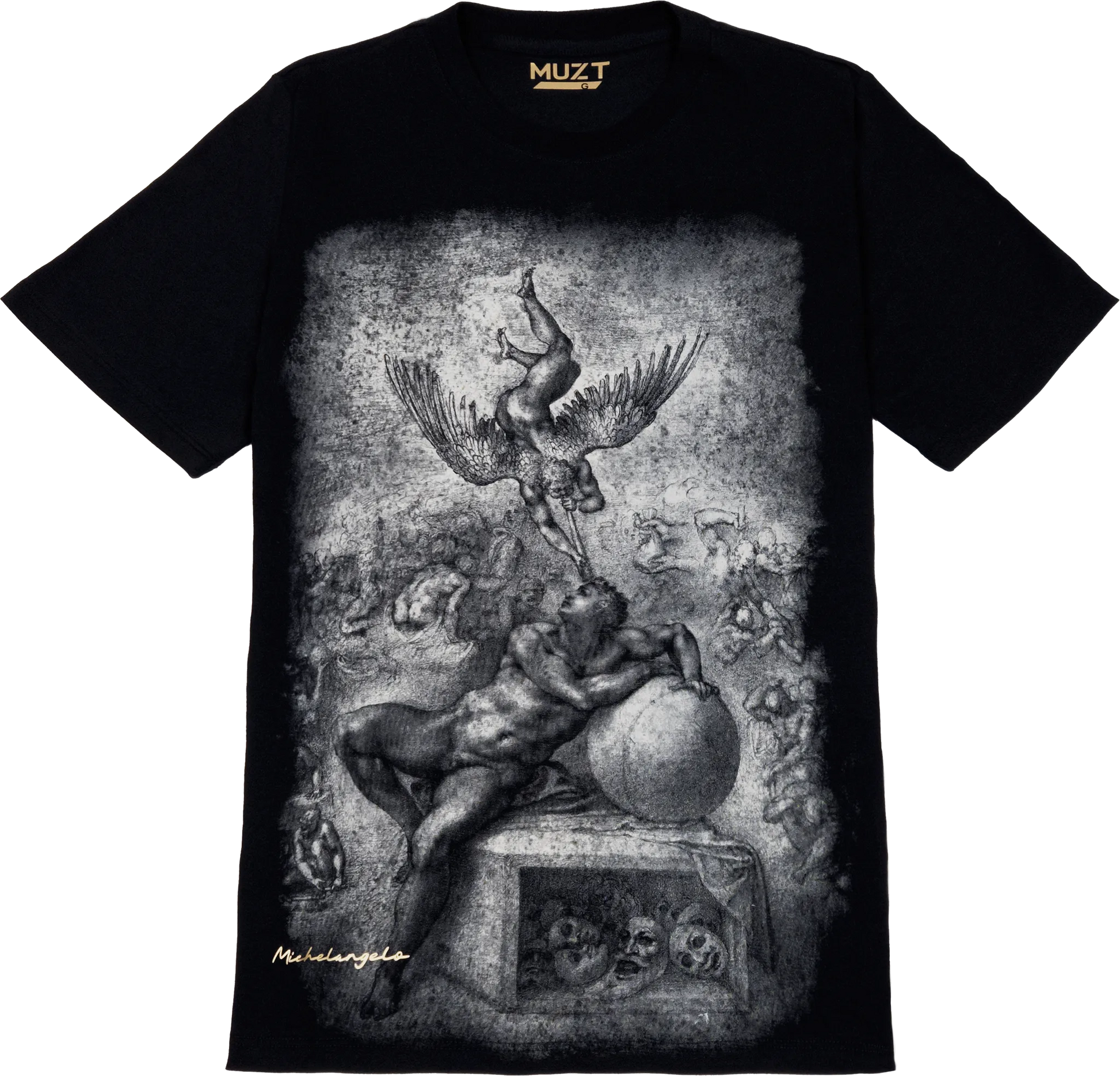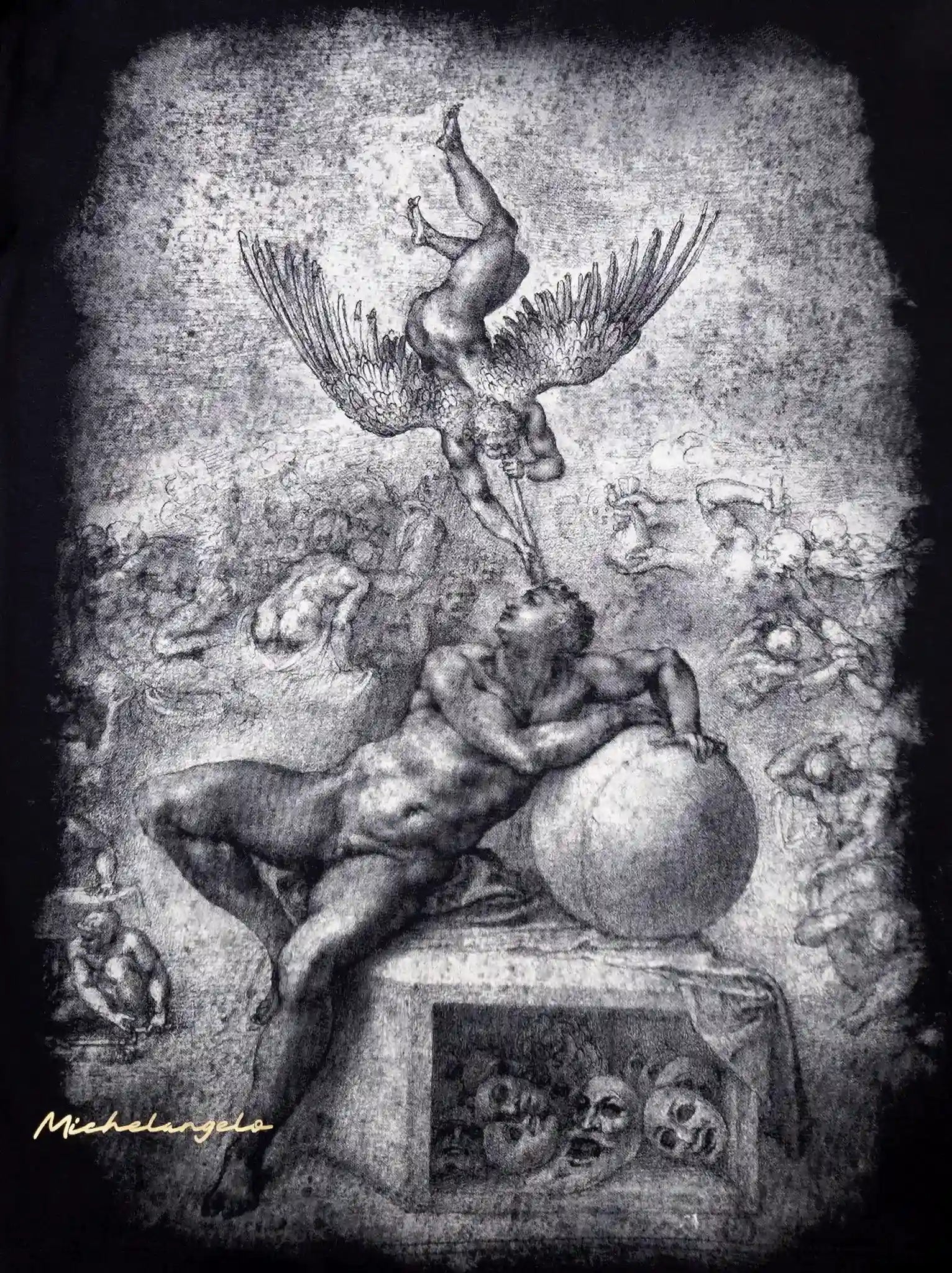 Un tributo a la grandeza de Michelangelo. Inspirada en su obra “Il Sogno”, esta playera captura la intensidad del Renacimiento: figuras llenas de energía, dramatismo y belleza atemporal.